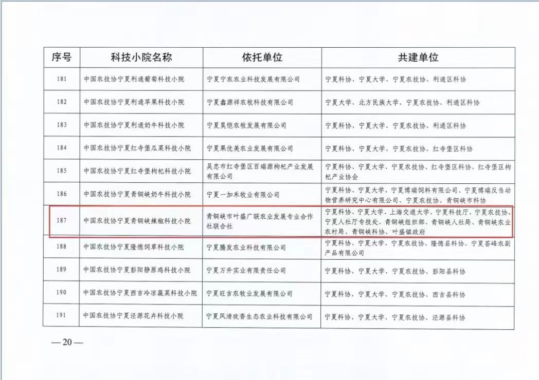 辣椒科技小院设在宁夏青铜峡市叶盛镇蒋滩村,依托单位为青铜峡市叶盛广联农业发展专业合作社联合社,共建单位有11家,包括宁夏科协、uu娱乐