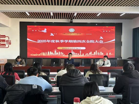 2025年秋季学期第四次全院大会在明远楼512会议室召开,对2025年度学院各项工作进行系统总结,并对2026年重点工作进行谋划部署。会议由学院党总支书记李文华主持,全体教职工参加会议。
