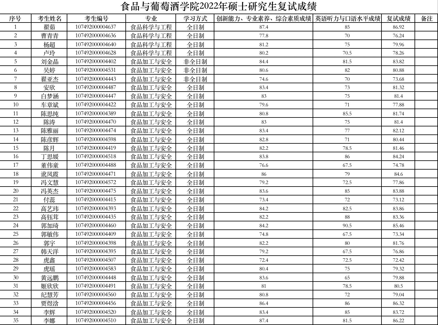 食品与葡萄酒学院2022年硕士研究生复试成绩
